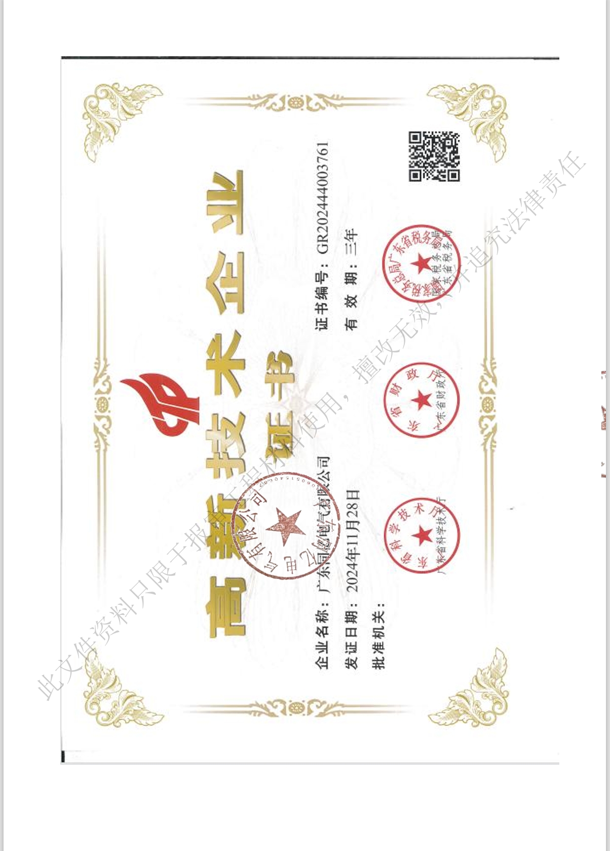 | 发证机构 | 广东省科学技术厅,广东省财政厅,国家税务总局广东省税务局 | 发证时间 | 2024-11-28 |